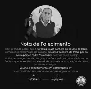 Ex-morador de Borrazópolis e pai do Padre Paulo Sidnei de Jardim Alegre, faleceu 4 de dezembro de 2025 Ler notícia