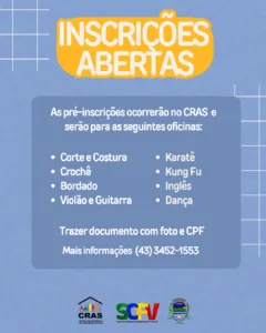 BORRAZÓPOLIS – Pré-inscrições para as oficinas do Serviço de Convivência e Fortalecimento de Vínculos 27 de janeiro de 2026 Ler notícia