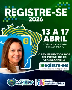 A Prefeitura de Cambira aderiu à ação Registre-se 2026 – Semana Nacional do Registro Civil 6 de abril de 2026 Ler notícia