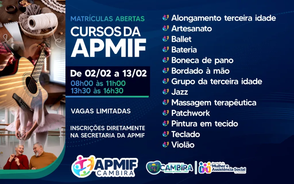 A APMIF de Cambira está com matrículas abertas para diversos cursos gratuitos voltados à comunidade. As inscrições acontecem no período de 02 a 13 de fevereiro, diretamente na Secretaria da APMIF, com vagas limitadas.