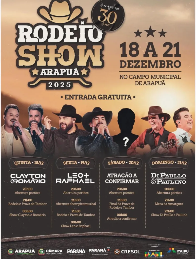 O Rodeio Show Arapuã 2025, que celebra os 30 anos do município, acontece entre os dias 18 e 21 de dezembro, no Campo Municipal, com entrada gratuita. A festa contará com rodeio, prova de tambor e grandes atrações musicais.