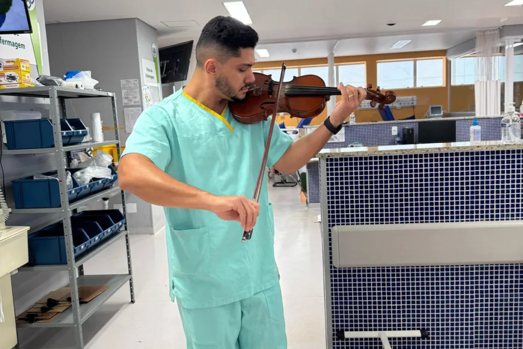 O projeto é desenvolvido pelo médico Joasly Belacusa, que também é violinista. Ele leva o instrumento à unidade e faz apresentações em áreas comuns e próximas aos leitos, envolvendo pacientes, equipes de enfermagem, médicos e demais profissionais. A proposta é utilizar a música como recurso de acolhimento, promovendo conforto e leveza no ambiente hospitalar.