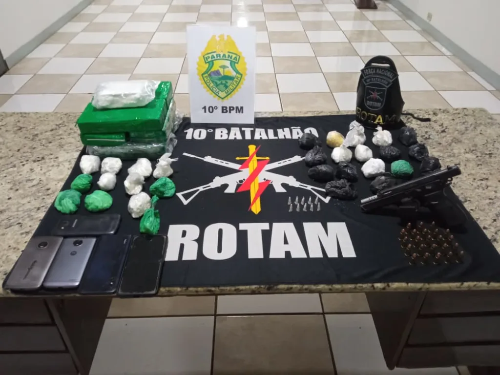 Já na delegacia, após conferência, constatou-se a apreensão de 3,081 kg de crack, 4,957 kg de cocaína, a pistola, as munições e cinco aparelhos celulares — um deles pertencente à moradora. A mulher foi conduzida à 17ª Subdivisão Policial de Apucarana.