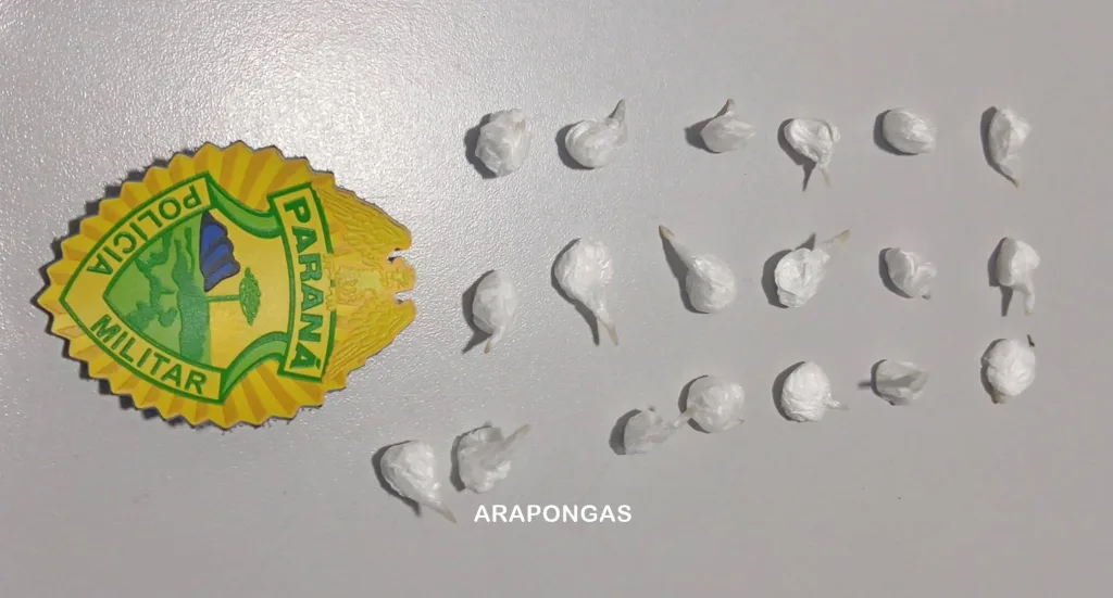 Durante patrulhamento, a equipe avistou dois indivíduos que, ao perceberem a aproximação da viatura, levantaram suspeita. Um deles arremessou um objeto em uma área de mata, enquanto o outro fugiu, não sendo localizado. O menor foi abordado e, embora nada de ilícito tenha sido encontrado com ele, os policiais localizaram, no local onde o objeto foi dispensado, um pote de vidro contendo uma sacola com 19 porções de cocaína, totalizando cerca de 6 gramas.