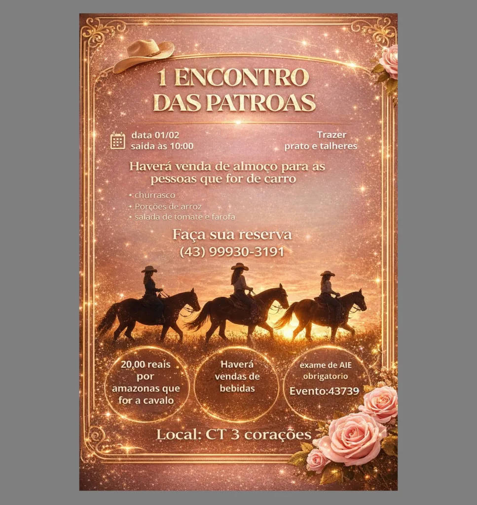 A saída da cavalgada está marcada para as 10h. O evento acontece no CT 3 Corações, localizado no bairro Romeópolis, no município de Arapuã. A organização orienta os participantes a levarem prato e talheres.
