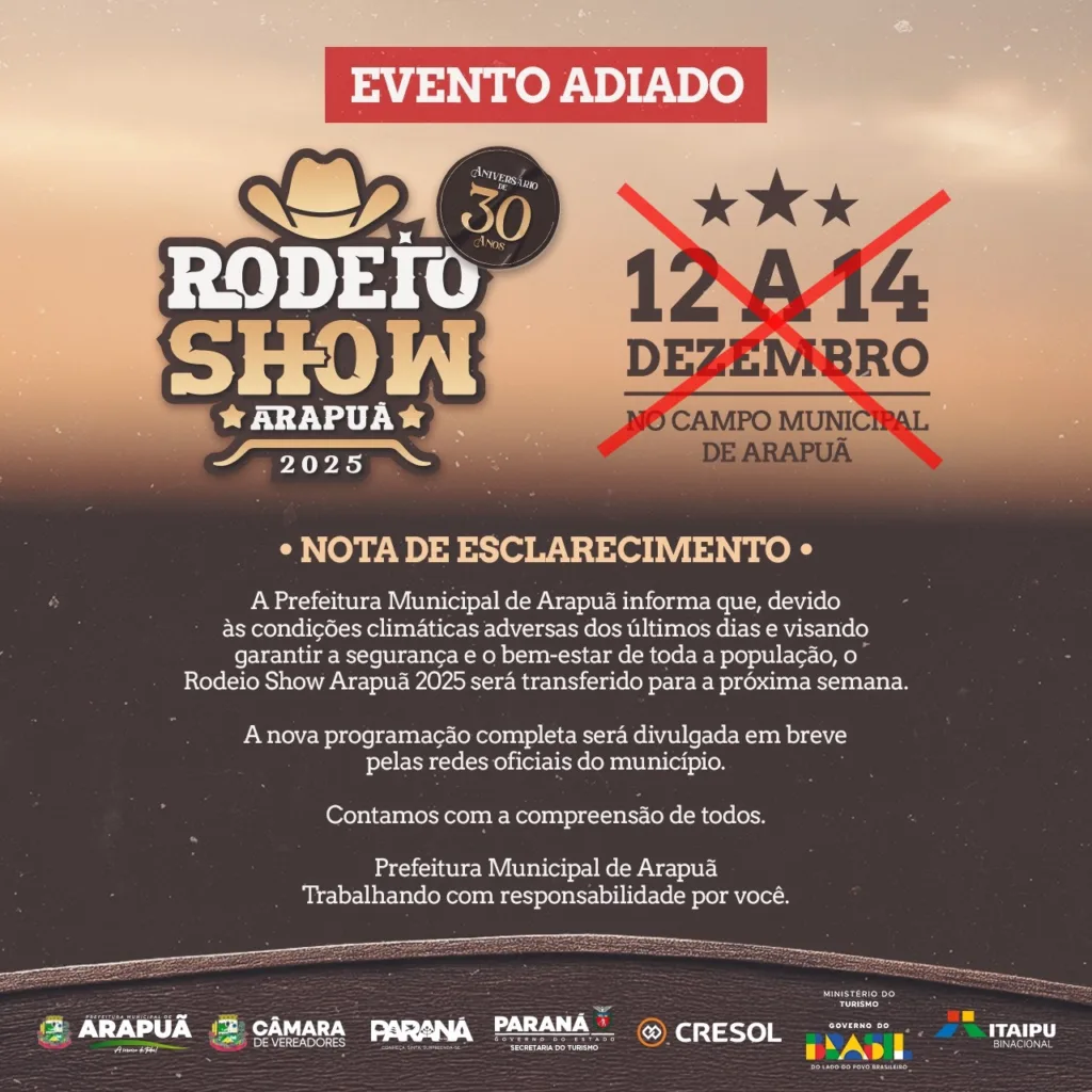 A Prefeitura de Arapuã anunciou, nesta quarta-feira (10 de dezembro), o adiamento do Rodeio Show Arapuã 2025 e das festividades pelos 30 anos de emancipação política do município, que estavam programadas para os dias 12, 13 e 14 de dezembro. A decisão foi tomada devido às condições climáticas adversas dos últimos dias, que comprometeram a segurança do espaço e poderiam colocar em risco o público, artistas e equipes de trabalho.
