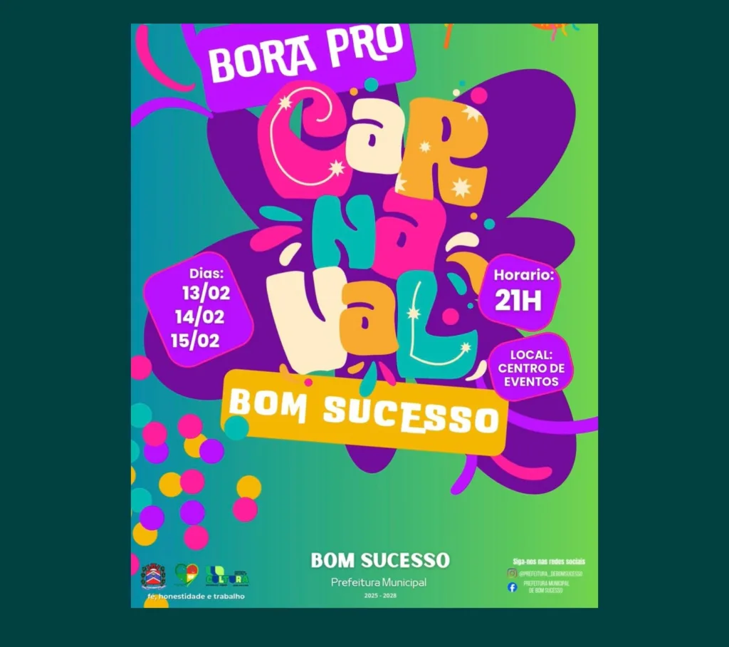 O clima de folia já toma conta de Bom Sucesso. O Carnaval do município começa nesta sexta-feira, 13 de fevereiro, e segue até domingo, dia 15, prometendo reunir um grande público no Centro de Eventos.
