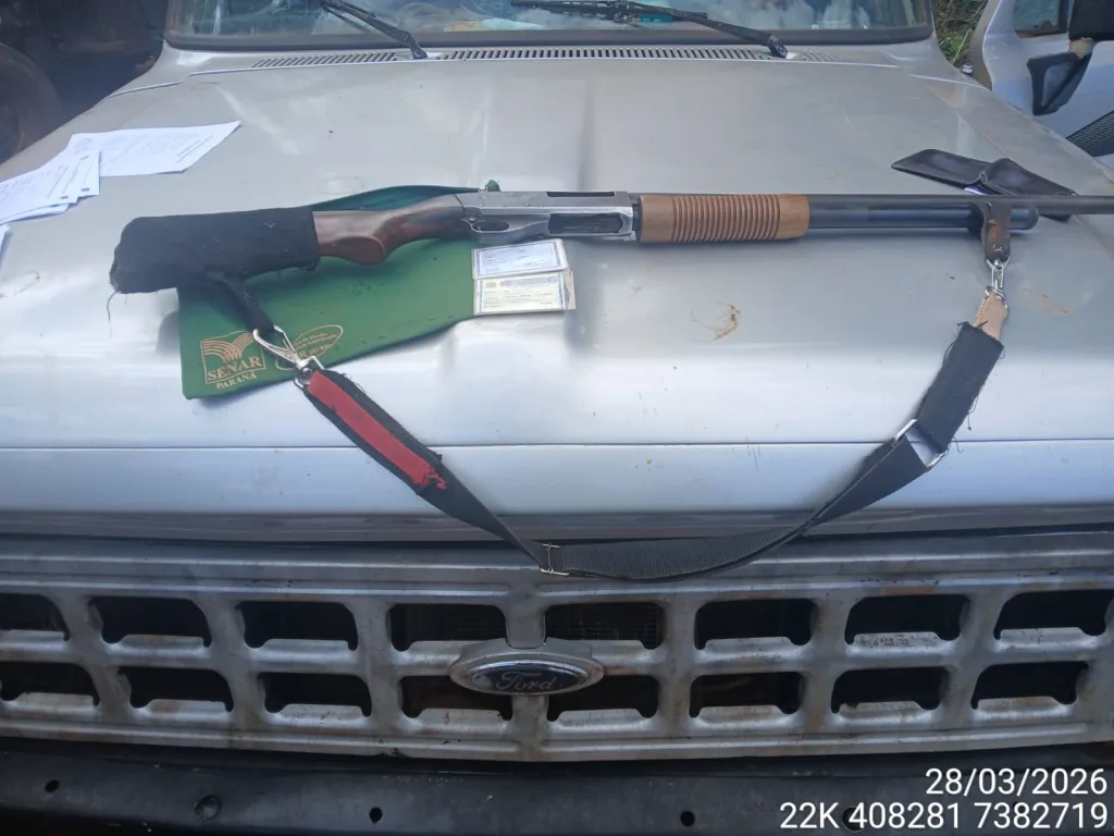 Na sequência, a equipe localizou uma caminhonete Ford F1000, com placas de Sarandi, estacionada em um carreador. Após alguns minutos, o proprietário do veículo, um homem, compareceu ao local e informou ser CAC (Colecionador, Atirador e Caçador). Ele apresentou uma espingarda calibre 12, que estava no interior do veículo, além de documentos do armamento.