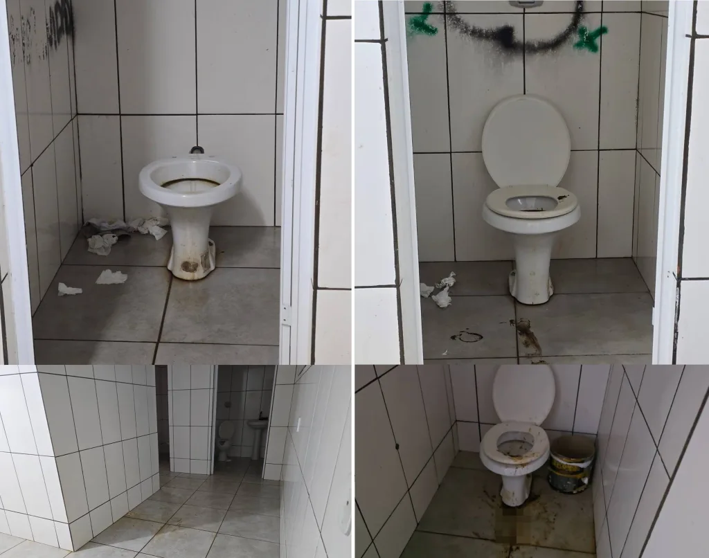 As imagens revelam condições precárias de limpeza, com sujeira espalhada, papéis no chão e até resíduos que tornam o uso praticamente inviável para a população. Nossa reportagem preservou algumas fotos, porque seria um desrespeito com o leitor do Blog. Segundo relatos, o problema não é recente e já vem sendo motivo de reclamação por parte da comunidade.