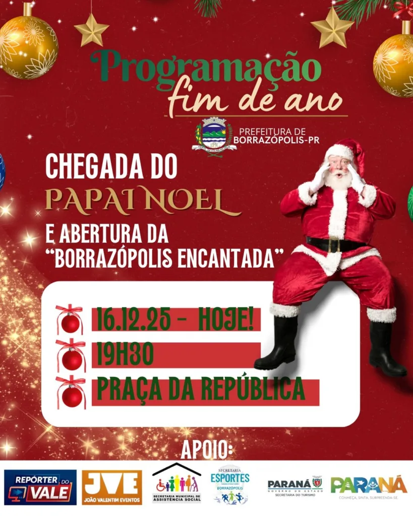 Borrazópolis entra no clima do Natal nesta terça-feira, 16 de dezembro, com a chegada do Papai Noel e a abertura oficial da “Borrazópolis Encantada”. O evento está marcado para as 19h30, na Praça da República, e dá início à programação de fim de ano no município.