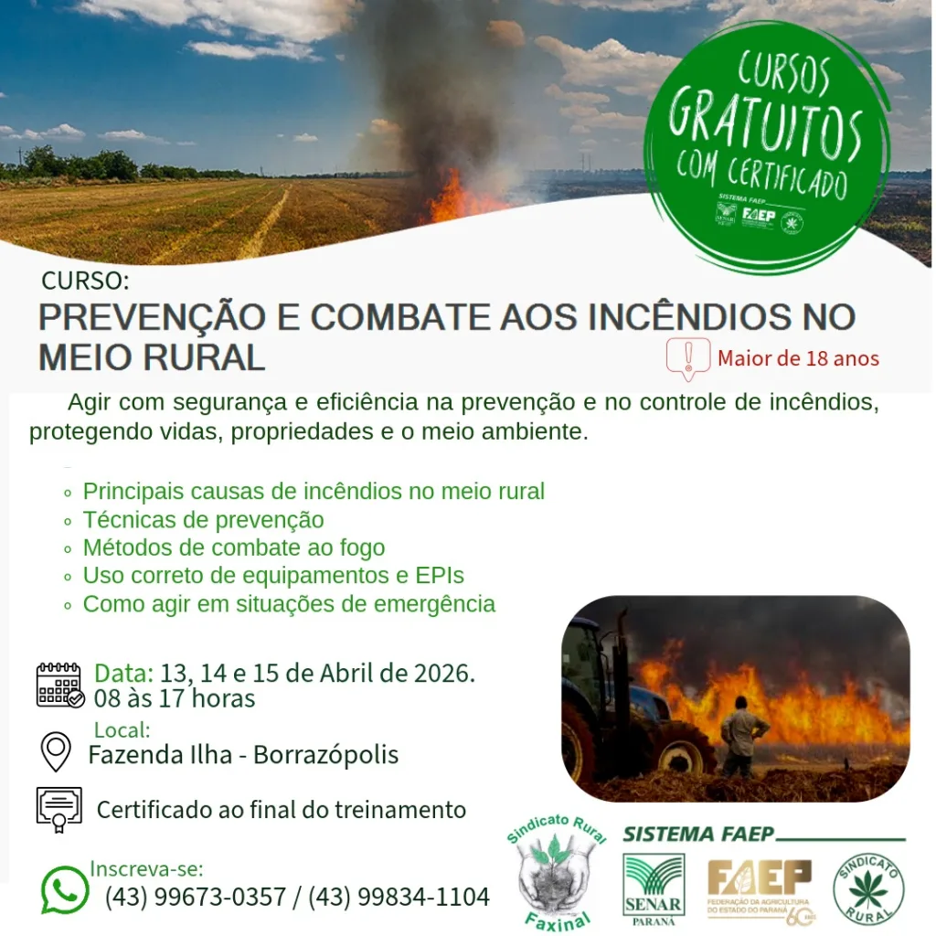 Entre as opções está o curso de Prevenção e Combate aos Incêndios no Meio Rural, que será realizado nos dias 13, 14 e 15 de abril, das 08h às 17h, na Fazenda Ilha, em Borrazópolis. O treinamento aborda desde as principais causas de incêndios até técnicas de combate ao fogo, uso de equipamentos de proteção e como agir em situações de emergência.