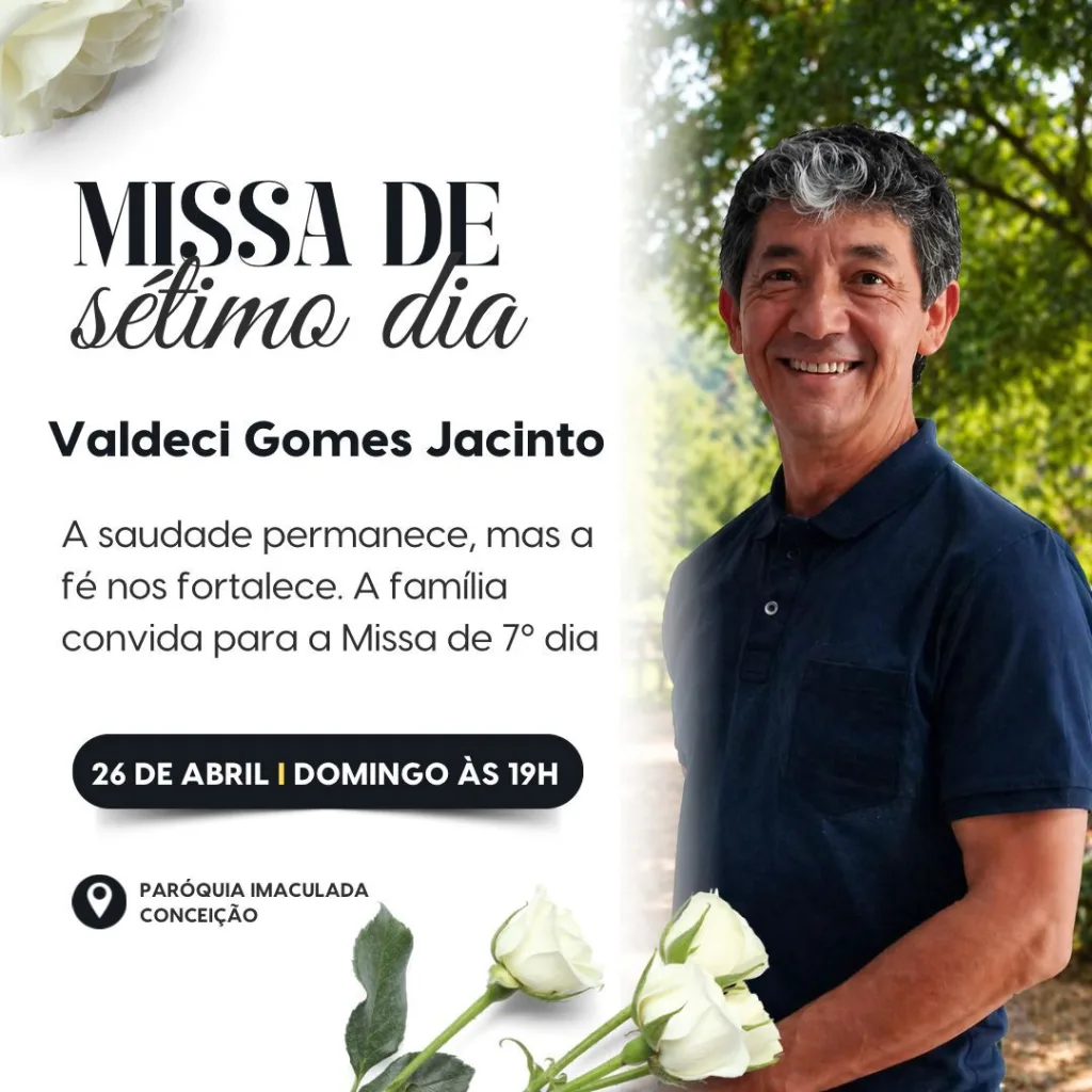 A família de Valdeci Gomes Jacinto (Valdecir do Joval), convida parentes, amigos e toda a comunidade para a missa de sétimo dia em sua memória.