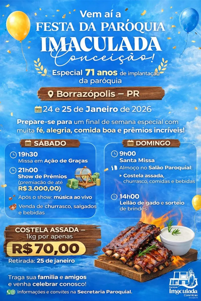 BORRAZÓPOLIS – Festa da Paróquia Imaculada Conceição neste sábado e domingo: 24 e 25/01