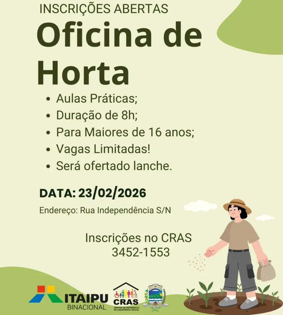 A Itaipu Binacional, o Itaipu Parquetec e o Conselho de Desenvolvimento dos Municípios Lindeiros ao Lago de Itaipu, por meio dos Núcleos de Cooperação Socioambiental, em parceria com a Secretaria Municipal de Agricultura e a Secretaria Municipal de Desenvolvimento e Assistência Social, irão realizar a Oficina da Horta, uma iniciativa voltada à promoção da sustentabilidade e do fortalecimento comunitário.