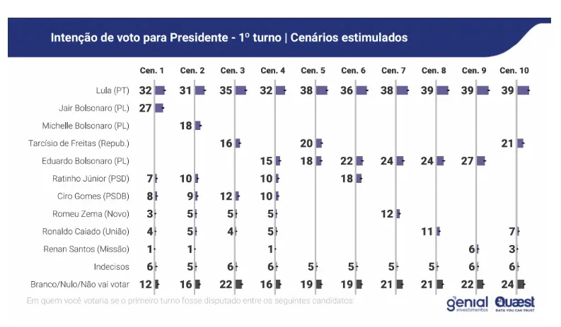 Apesar desse cenário, o estudo indica que Lula venceria as eleições presidenciais se o pleito fosse realizado hoje. No campo da direita, o levantamento mostra a consolidação de Flávio Bolsonaro como principal nome na disputa, ocupando o segundo lugar atrás de Lula em cenários de primeiro turno. Em uma simulação considerada mais provável, Lula aparece com 35% das intenções de voto, seguido por Flávio Bolsonaro com 26% e pelo governador do Paraná, Ratinho Júnior, com 9%.