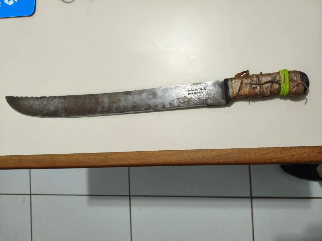 Enquanto a equipe colhia as informações, o autor passou nas proximidades e foi reconhecido pela vítima. Ele foi abordado e, em sua cintura, os policiais localizaram um facão de grande porte, apontado como o objeto utilizado na agressão.