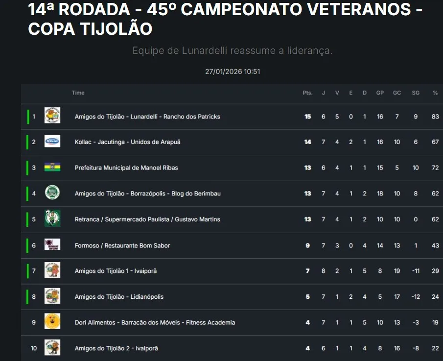A 14ª rodada do 45º Campeonato Veteranos – Copa Tijolão foi disputada no último sábado, dia 24 de janeiro de 2026, na sede da Go Drill Sports, em Ivaiporã, com jogos movimentados e mudanças importantes na parte de cima da tabela.