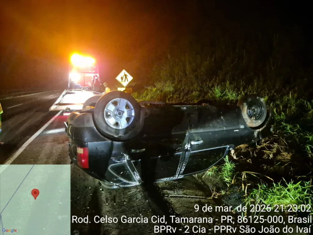 Um capotamento foi registrado na noite desta segunda-feira (9 de março de 2026) na rodovia , no km 14 mais 550 metros, entre Londrina e Tamarana.