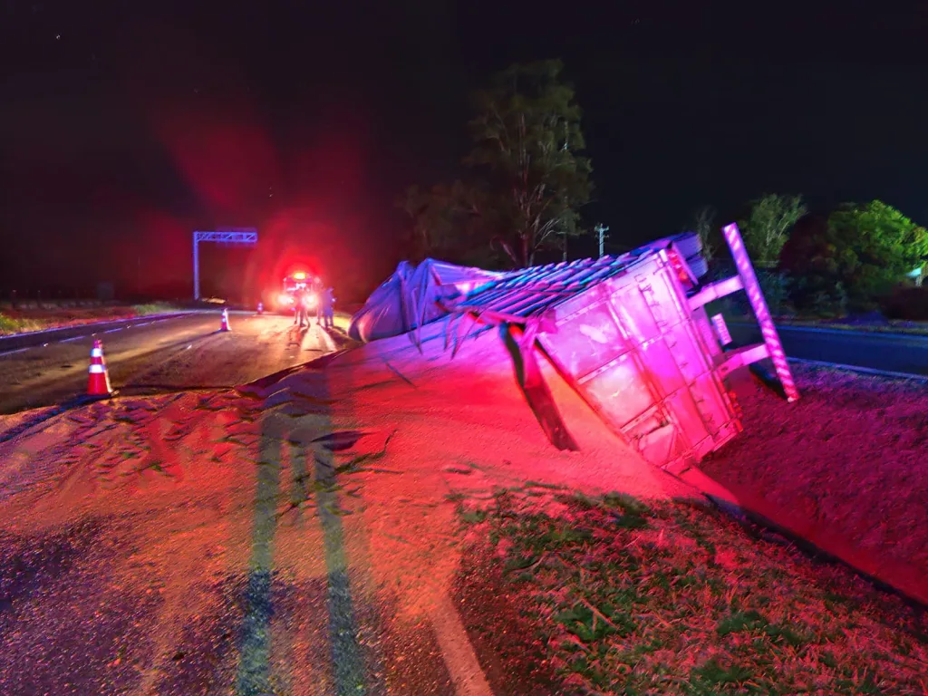 Uma carreta carregada com grãos tombou após sair da pista na BR-376, no trecho entre Mandaguari e Jandaia do Sul. O acidente aconteceu na noite de 09 de abril, quando o veículo seguia no sentido Jandaia do Sul.