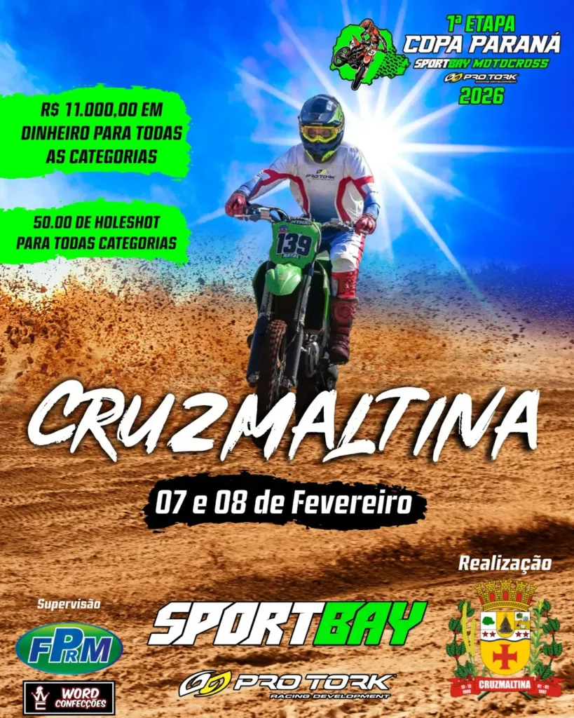 Em entrevista à Rádio Nova Era e ao Blog do Berimbau, o organizador Fábio Brito, o “Fabinho”, confirmou que Cruzmaltina vai sediar, nos dias 7 e 8 de fevereiro, a abertura da Copa Paraná de Motocross, evento que promete movimentar o município e toda a região do Vale do Ivaí.