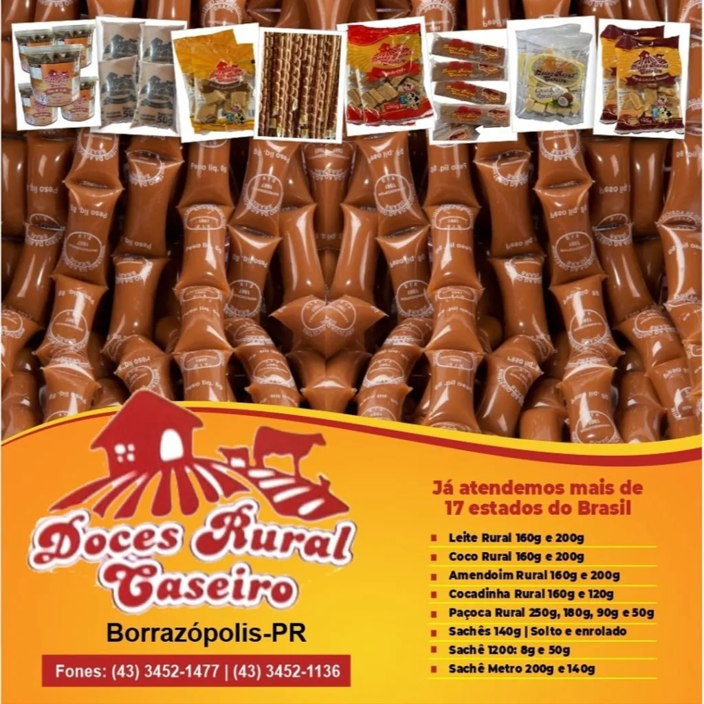 Doces Rural Caseiro é produzido em Borrazópolis-Pr., no mais alto padrão de qualidade, e está presente em mais de 17 Estados. Você encontra os doces em: “Cocadinha” na embalagem de pacotinho com 120 e 160 gramas. A deliciosa Paçoca de 50, 90, 180 e 250 gramas. Tem Sachês soltos e enrolados de 140 e 200 gramas.