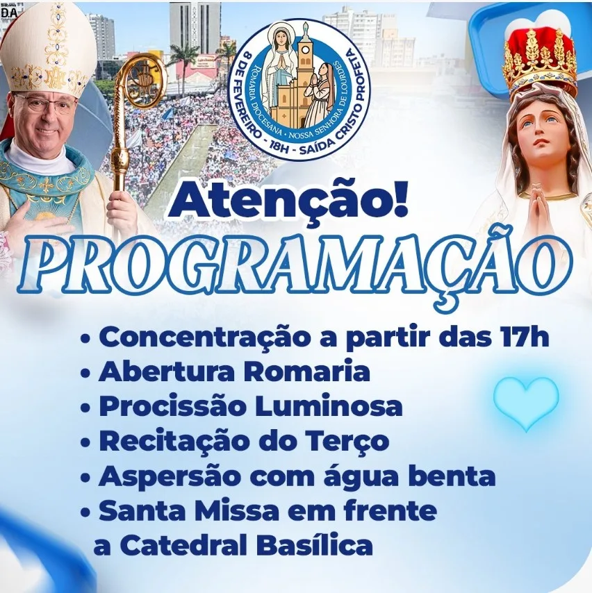 A programação terá início a partir das 17h, com concentração em frente à Paróquia Cristo Profeta. Às 18h, os fiéis seguem em procissão, com recitação do terço e rito de aspersão com água benta, até a Catedral Basílica Nossa Senhora de Lourdes. No local, será celebrada missa campal presidida pelo bispo diocesano Dom Carlos, seguida de procissão luminosa com a imagem da padroeira.