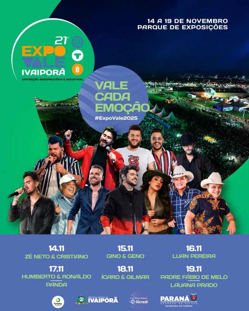 A cidade de Ivaiporã se prepara para receber a 21ª edição da Expovale, que acontece de 14 a 19 de novembro no Parque de Exposições. O evento, considerado a maior feira agropecuária, industrial e cultural do Vale do Ivaí, promete ser a maior de todos os tempos, reunindo grandes shows, ampla estrutura e diversas atrações.