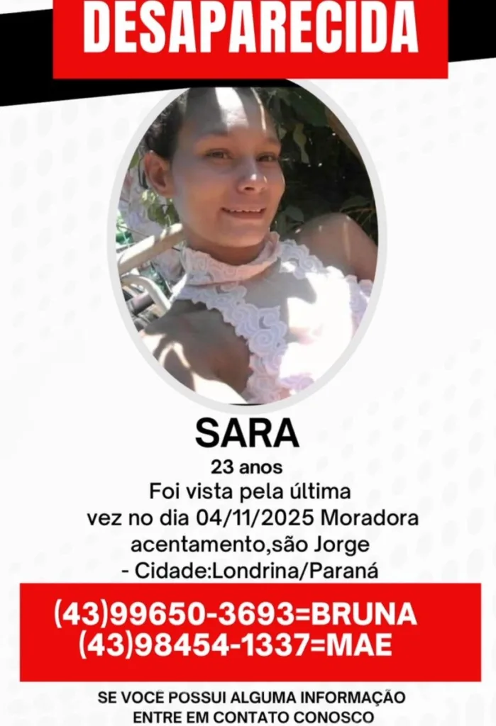 A família de Sara Oliveira de Lima, de 23 anos, moradora do Assentamento São Jorge, em Londrina, está em busca de informações sobre seu paradeiro. Ela foi vista pela última vez no dia 4 de novembro de 2025 e, desde então, não fez contato com os familiares.