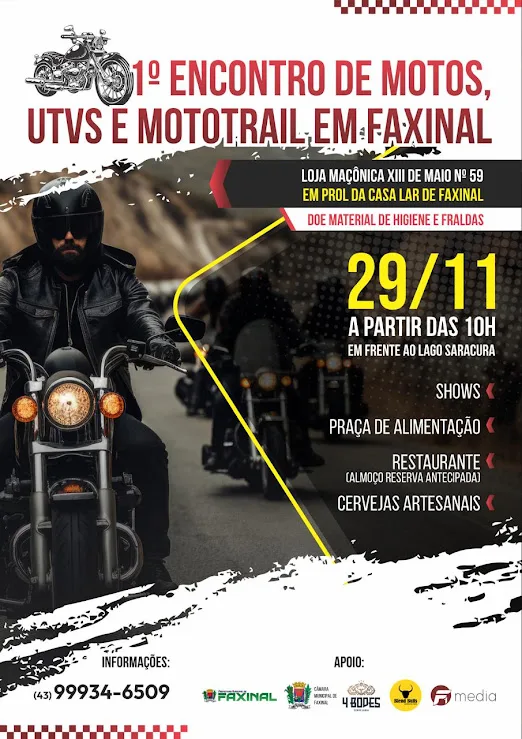 Neste dia 29 de novembro, Faxinal vai sediar o 1º Encontro Beneficente de Motoclubes, UTVs e Mototrail, um grande evento que promete reunir motociclistas e amantes do esporte de diversas regiões. A concentração será a partir das 10h, em frente ao Lago Saracura, cartão-postal do município. O encontro é organizado pela Loja Maçônica XIII de Maio nº 59, com apoio da Prefeitura e da Câmara Municipal, e tem caráter solidário: toda a ação será em prol da Casa Lar de Faxinal, instituição que há quase 30 anos acolhe crianças e adolescentes do município sede e de outras cidades do Vale do Ivaí, como Borrazópolis, Cruzmaltina e Grandes Rios. Durante o evento haverá shows, praça de alimentação, restaurante com almoço mediante reserva antecipada e também cervejas artesanais. A entrada é gratuita, mas os organizadores pedem que os participantes colaborem com a doação de materiais de higiene e fraldas, que serão destinados à Casa Lar. Segundo os organizadores, a intenção é proporcionar um dia de confraternização e solidariedade: “Nossa ideia é reunir o maior número possível de motociclistas e UTVs em um encontro fraterno, abraçando e apoiando a Casa Lar, que tanto faz pela nossa comunidade”, diz nota dos organizadores. Mais informações: (43) 99934-6509.