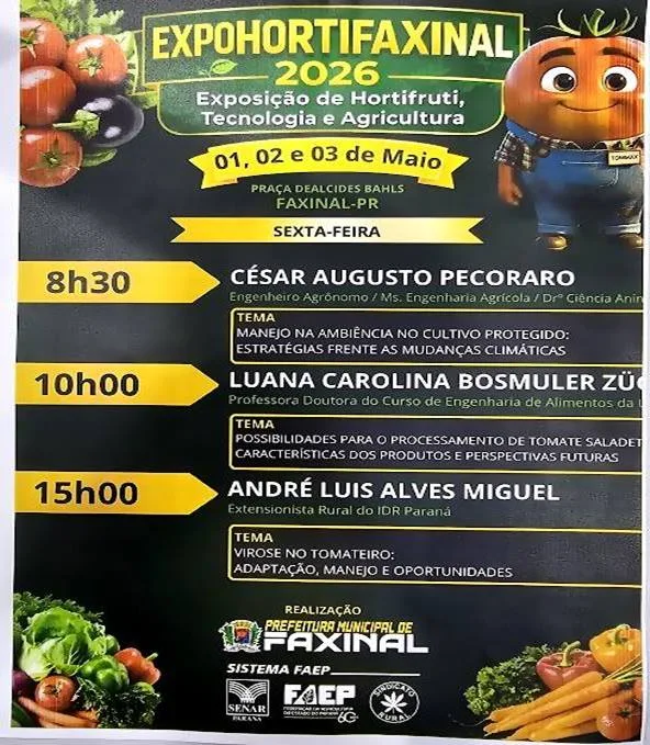 A feira acontece entre os dias 1º e 3 de maio, na Praça Dealcidas Bahls, no centro de Faxinal, e terá foco técnico voltado à agricultura, com palestras, exposições de tecnologias, máquinas e inovações no setor hortifruti. Segundo o secretário Reginaldo, o evento foi planejado como um grande encontro de conhecimento, reunindo produtores, especialistas, empresas e até instituições de ensino, com participação confirmada de caravanas de diversos municípios da região.