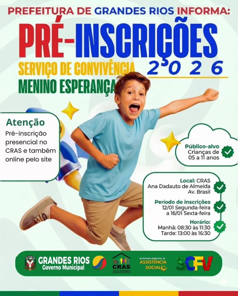 A Prefeitura de Grandes Rios anunciou a abertura das pré-inscrições para o Serviço de Convivência Menino Esperança, referente ao ano de 2026. O atendimento é voltado a crianças com idades entre 5 e 11 anos.