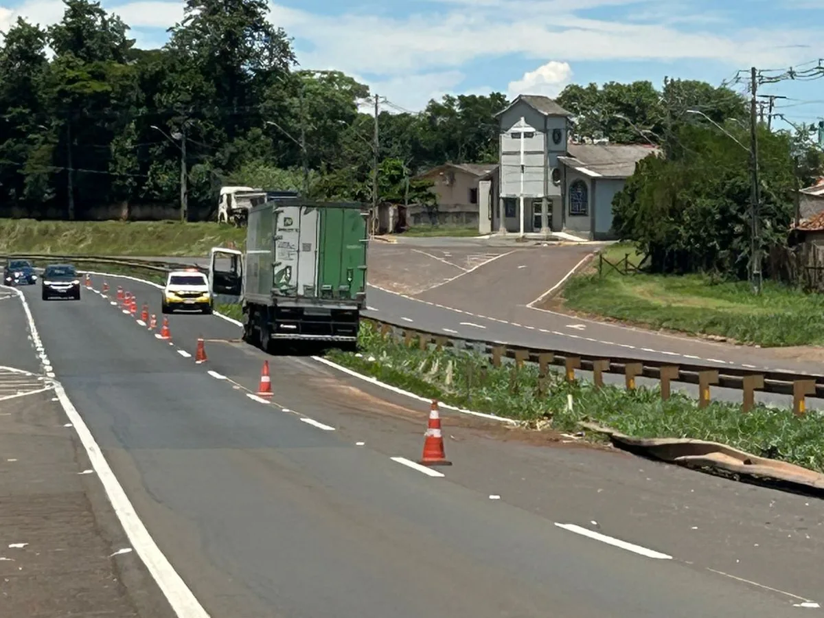Uma carreta perdeu o controle, atingiu o guard-rail e parou atravessada na pista contrária da BR-376, em Apucarana, na quarta-feira, 18 de fevereiro.