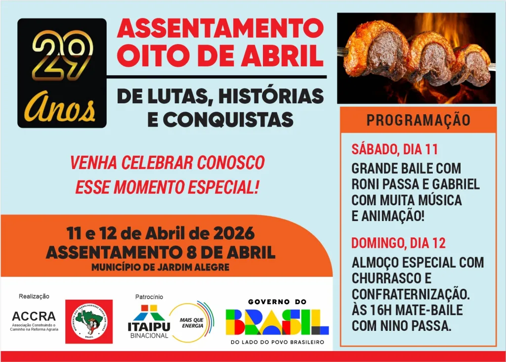 O Assentamento 8 de Abril, em Jardim Alegre, se prepara para comemorar seus 29 anos de história com uma grande festa nos dias 11 e 12 de abril de 2026. O evento promete reunir moradores do assentamento e de toda a região, celebrando uma trajetória marcada por lutas, conquistas e desenvolvimento no campo.