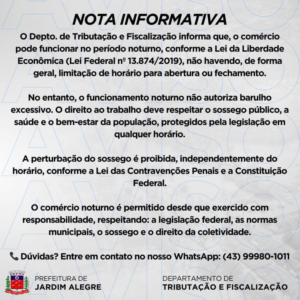 Atendendo a questionamentos de comerciantes e da população, a Prefeitura de Jardim Alegre divulgou uma nota informativa esclarecendo as regras sobre o funcionamento do comércio no período noturno no município.