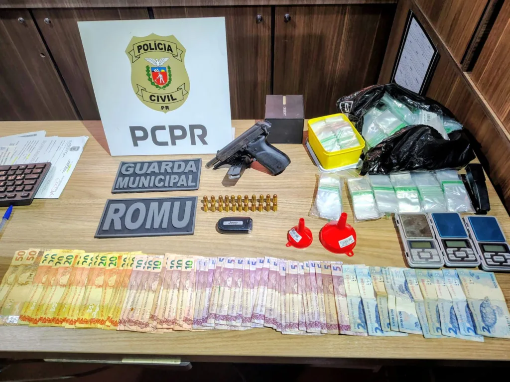 Na residência do suspeito, as equipes encontraram uma pistola calibre .380, além de materiais normalmente associados à preparação e venda de entorpecentes, como balanças de precisão e sacos plásticos tipo ziplock. Segundo a polícia, os objetos estavam escondidos no forro do imóvel, o que indicaria tentativa de ocultação.