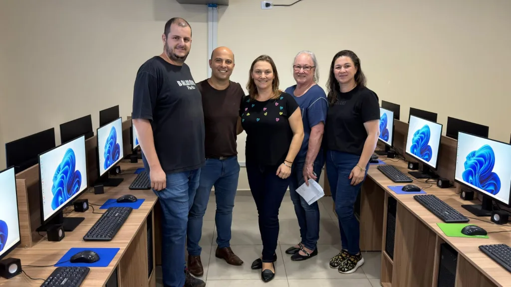 Pela primeira vez, a escola recebeu um laboratório moderno, equipado com 25 computadores de mesa para uso dos alunos. O investimento também contempla a Escola Renato Siloto, que receberá outros 25 equipamentos, totalizando 50 novos computadores adquiridos pelo município. Além disso, foram entregues 45 notebooks à Secretaria de Educação, que serão destinados às novas professoras nomeadas por concurso, fortalecendo o trabalho pedagógico em sala de aula.