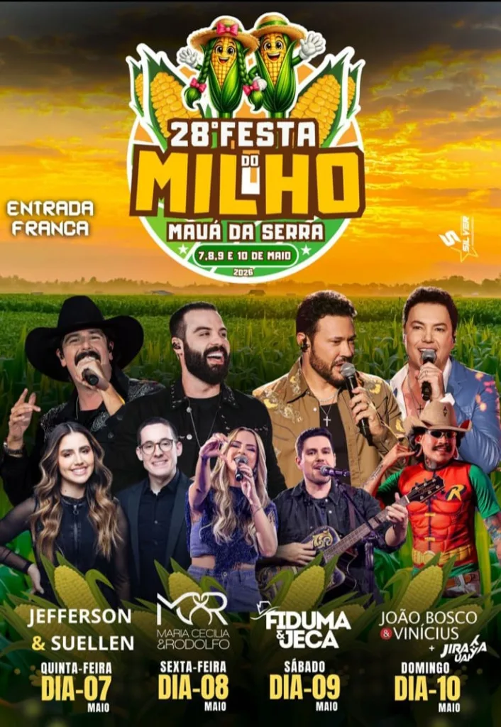 A Prefeitura de Mauá da Serra divulgou oficialmente, nesta quinta-feira, 8 de janeiro, a programação completa da 28ª edição da tradicional Festa do Milho, um dos eventos mais aguardados do ano na região. O anúncio foi feito pelo prefeito Giva Lopes, que já havia antecipado algumas atrações ao repórter Ronaldo Senes, o Berimbau, e agora confirmou todos os shows e datas.