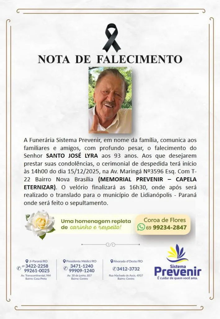 O ex-prefeito de Jardim Alegre, Santo José Lyra, faleceu aos 93 anos na madrugada desta segunda-feira, 15 de dezembro de 2025, em Rondônia. A morte foi comunicada pela família por meio da Funerária Sistema Prevenir, causando grande comoção entre amigos, familiares e moradores da região onde construiu sua trajetória pública.