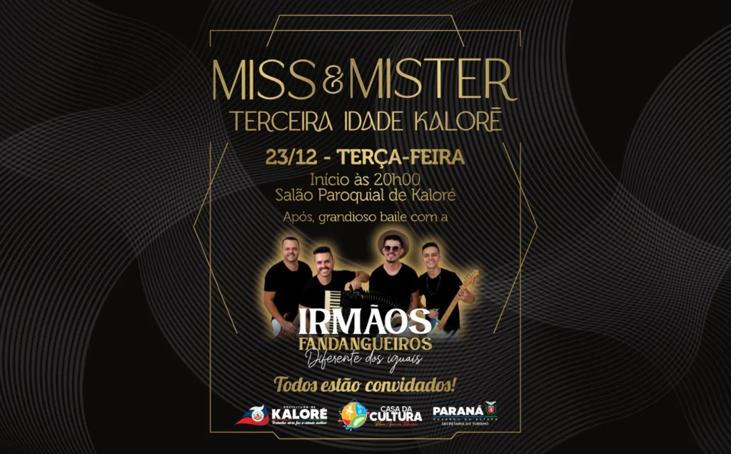 A Prefeitura de Kaloré e Casa da Cultura, com apoio do Governo do Estado e Secretaria de Turismo, convidam toda população para prestigiar o concurso Miss & Mister Terceira Idade, um evento que valoriza a melhor idade e fortalece a convivência social, a autoestima e o protagonismo dos idosos no município.