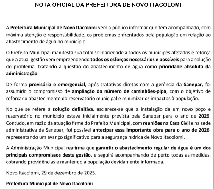 A Prefeitura de Novo Itacolomi também divulgou nota oficial, informando que acompanha a situação com atenção e responsabilidade. A administração municipal afirma que trata o problema do abastecimento como prioridade absoluta e que, de forma provisória e emergencial, após tratativas com a gerência da Sanepar, houve ampliação do número de caminhões-pipa para minimizar os impactos à população.