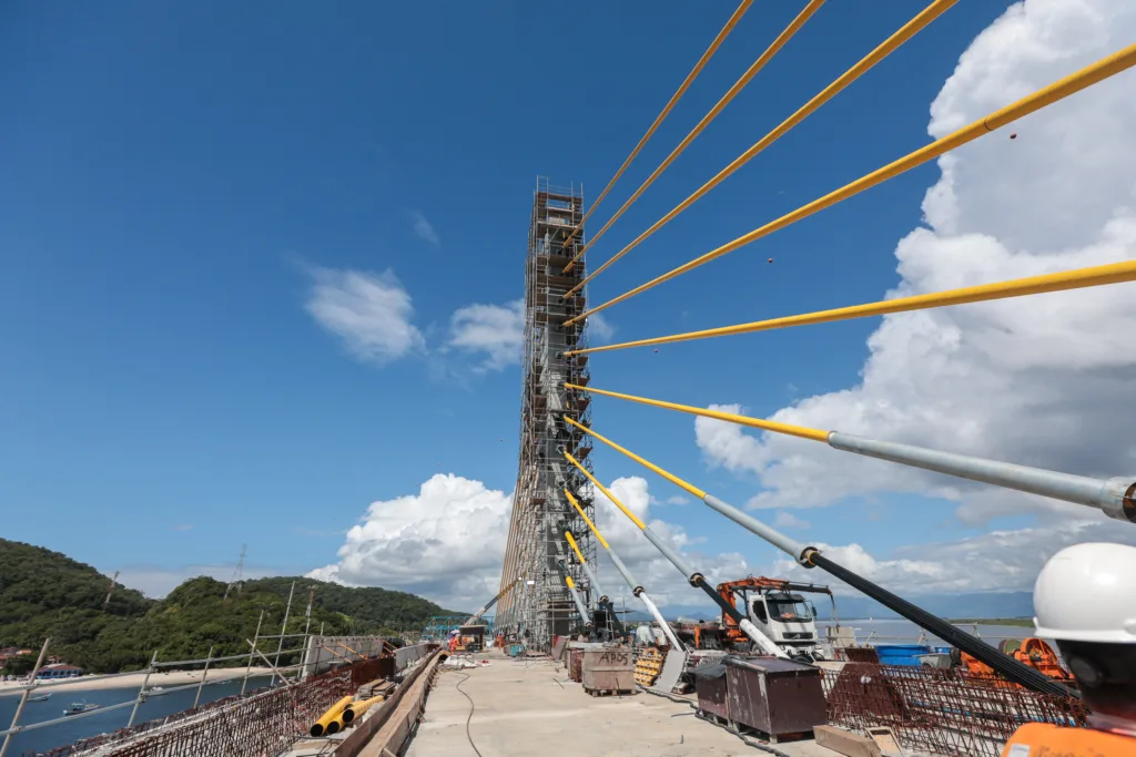 A instalação dos estais, cabos de aço responsáveis por sustentar o vão central da ponte, também evoluiu. Já são 11 pares fixados em cada um dos mastros dos apoios 4 e 5, garantindo a estabilidade necessária para a continuidade dos trabalhos na parte superior da estrutura.