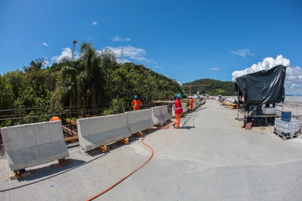 No trecho pré-moldado, foi finalizado o lançamento das 160 vigas longarinas previstas em projeto. A obra agora entra na fase de conclusão do tabuleiro e dos acabamentos finais, como pavimentação, drenagem, iluminação e implantação da ciclovia. Os trabalhos concentram-se nos três últimos vãos do tabuleiro, com lançamento de pré-lajes, armação e concretagem.