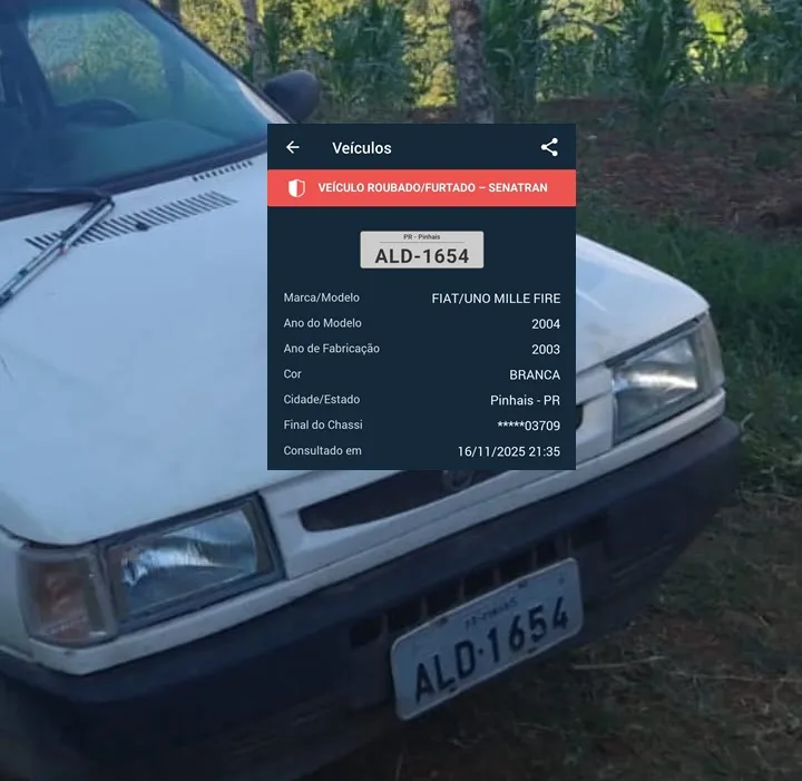Um veículo Fiat/Uno Mille Fire, cor branca, placas ALD-1654, de Pinhais (PR), foi furtado neste domingo, 16 de novembro, em Ortigueira.