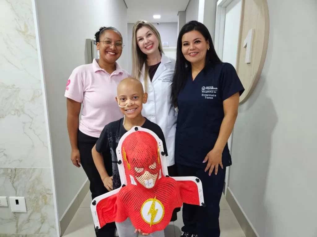 Pensando no bem-estar emocional do pequeno Vítor, as colaboradoras do setor de radioterapia decidiram transformar a máscara em algo especial. Elas personalizaram o acessório com o super-herói favorito do menino: o Flash.