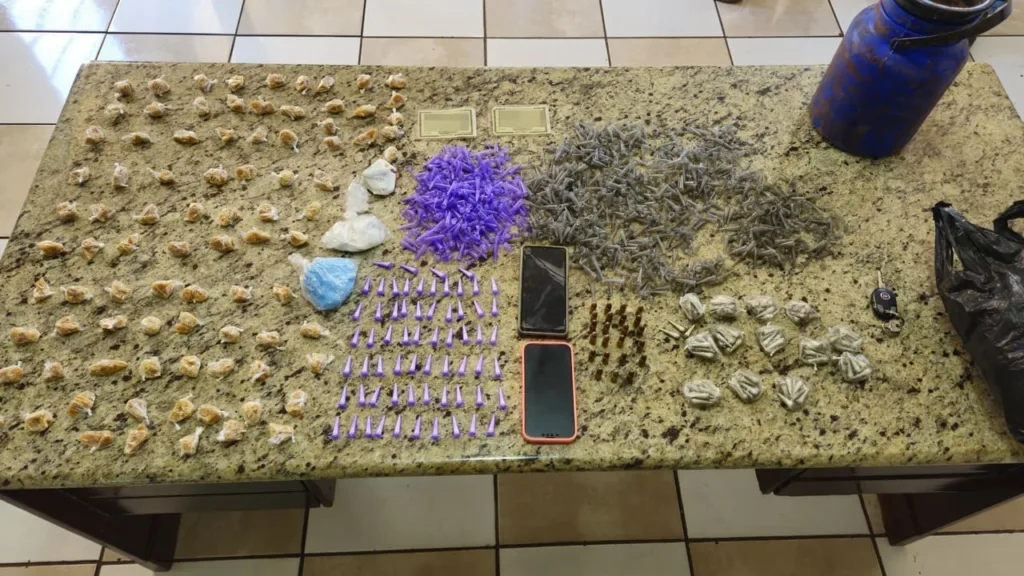 Na vistoria, os militares encontraram diversas embalagens plásticas, utilizadas para acondicionar drogas, e porções de cocaína. Além disso, foi localizado um recipiente enterrado na mata próxima, que continha 435 gramas de crack, três porções grandes de cocaína, dezenas de eppendorfs (cheios e vazios) e 23 munições intactas, calibre 9mm.