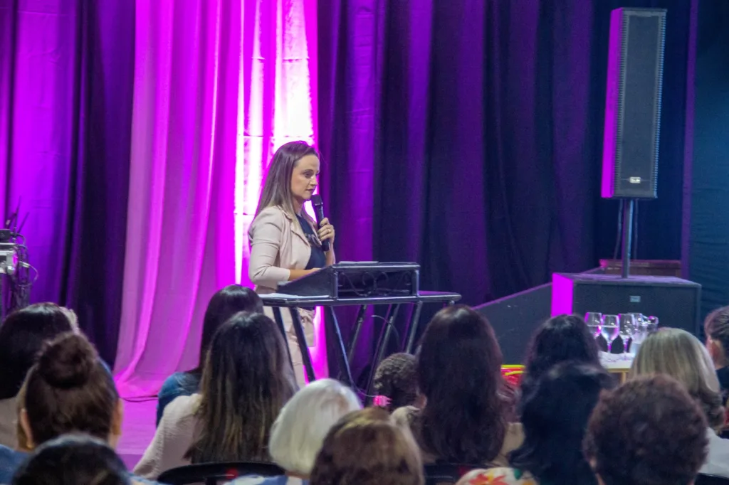 Na sequência, a professora e fonoaudióloga Kelly Cristina de Farias Wicthoff conduziu a palestra “Ser Mulher é Ser Voz”, tratando sobre empoderamento feminino e a importância da participação ativa das mulheres na sociedade.
