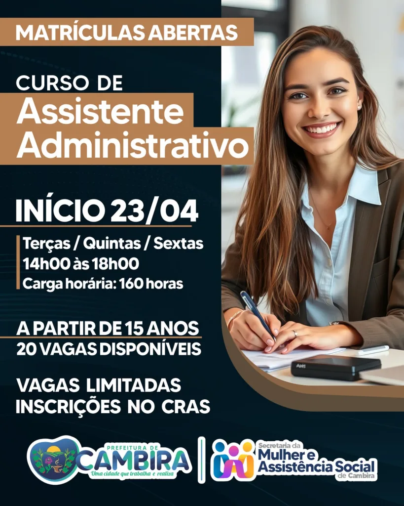 A Prefeitura de Cambira está com matrículas abertas para o curso de Assistente Administrativo, uma iniciativa voltada à qualificação profissional e à inserção de jovens e adultos no mercado de trabalho.