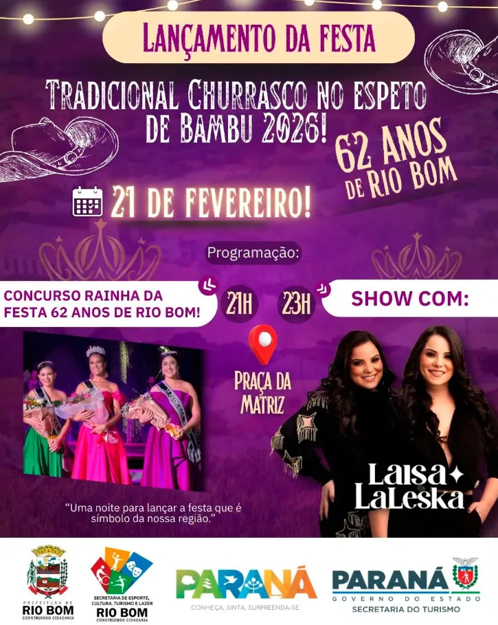 A Prefeitura de Rio Bom realiza no próximo dia 21 de fevereiro, na Praça da Matriz, o lançamento oficial da Festa do Tradicional Churrasco no Espeto de Bambu 2026. O evento marca o início das comemorações dos 62 anos do município e celebra uma das mais importantes tradições culturais da cidade e da região.
