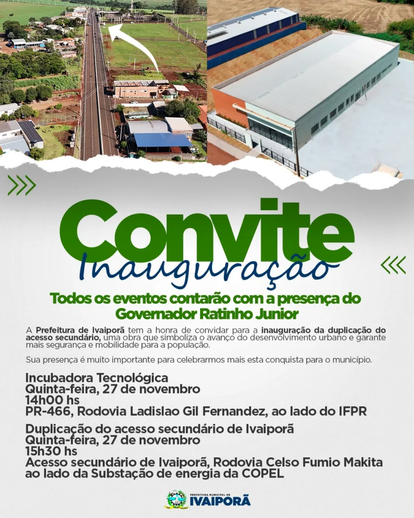 O governador Carlos Massa Ratinho Junior estará em Ivaiporã nesta quinta-feira, 27 de novembro, para inaugurar a duplicação do acesso pavimentado da PR-846, obra considerada um marco para a mobilidade urbana do município de Ivaiporã. O evento está marcado para as 15h30, na rodovia de acesso secundário, próximo da subestação da Copel.