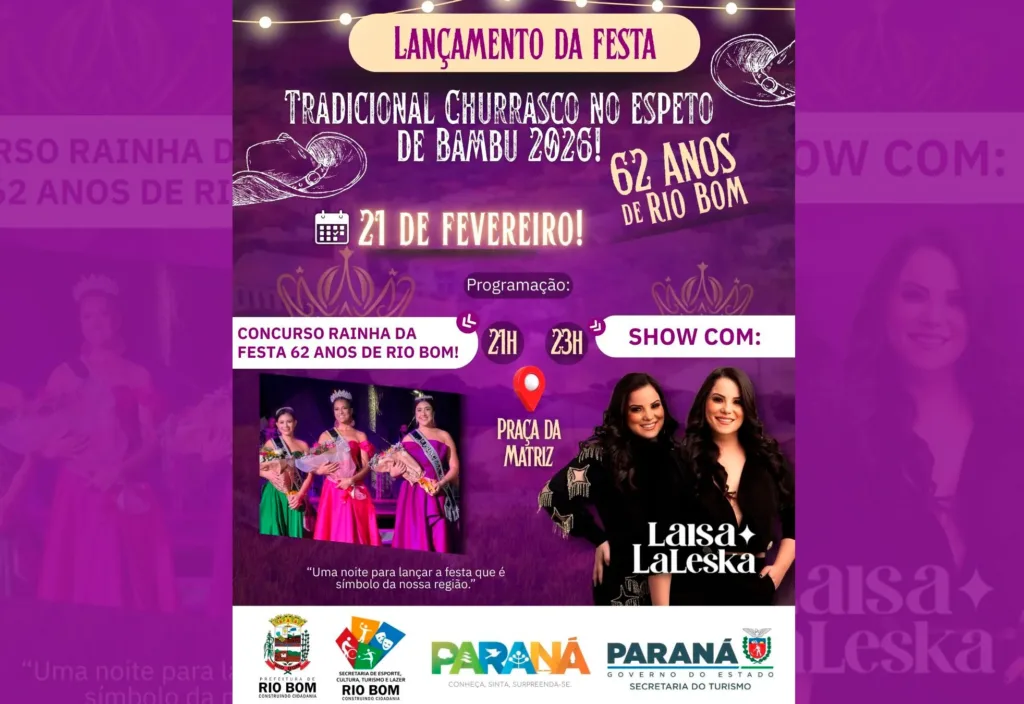 EVENTO – No dia 21 de fevereiro, na Praça da Matriz, acontecerá o lançamento oficial da Festa do Tradicional Churrasco no Espeto de Bambu 2026. O evento marca o início das comemorações dos 62 anos do município e celebra uma das mais importantes tradições culturais da cidade e da região. A programação da noite começa às 21h, com a realização do Concurso Rainha da Festa 62 Anos de Rio Bom, momento que valoriza a beleza, a representatividade e o envolvimento da comunidade local nas festividades do aniversário do município. Na sequência, às 23h, o público poderá prestigiar um grande show com Laisa e LaLeska, prometendo muita animação e um encerramento especial para a noite de lançamento.